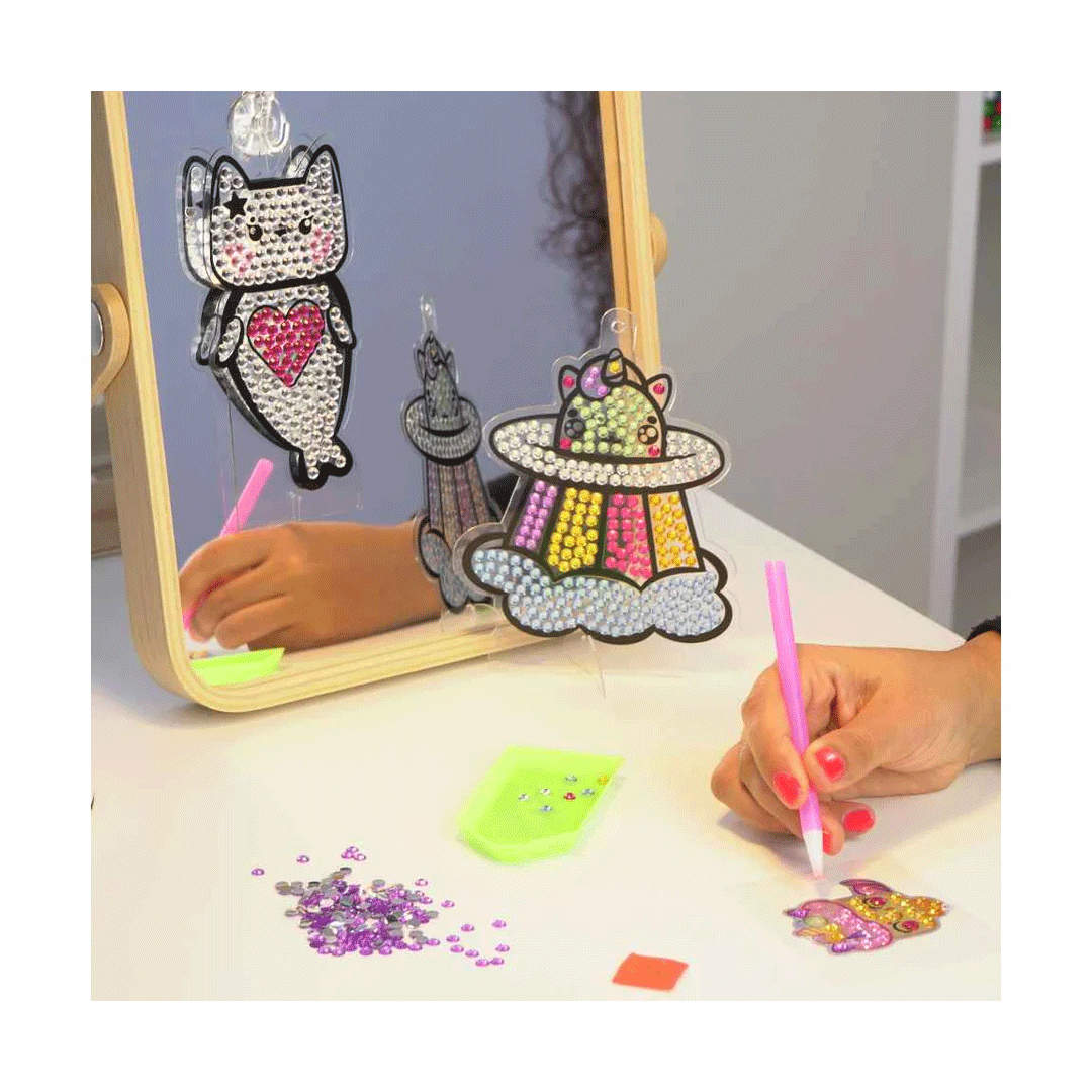 Diamantiny è la nuova attività per creare immagini fai-da-te da pitturare con le gemme 3D. Potrai realizzare tanti simpatici adesivi colorati, con effetto “mosaico” in rilievo, da incollare su diverse superfici come diari, scarpe, smartphone, mobili. Gli adesivi da gemmare ritraggono animali, unicorni, sirene, gelati e dolci e sono ideali per rendere le superfici colorate e divertenti. Oltre agli adesivi da gemmare sono presenti anche 2 acchiappa-sole da decorare e appendere grazie alla piccola ventosa oppure appoggiare al piedistallo, per creare effetti di luce nella stanza. Big Gems è un’attività molto semplice e rilassante che può aiutare i bambini a sviluppare le capacità manuali, di coordinazione e concentrazione. Segui le istruzioni e applica i diamantini colorati seguendo lo schema colore.