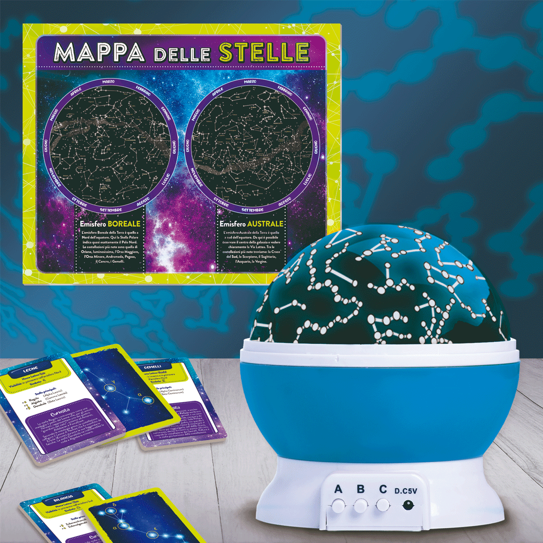 Un kit scientifico che ti permetterà di scoprire tantissime curiosità sulla volta celeste! Potrai studiare le stelle grazie alla mappa stellare e alle carte e osservare le costellazioni da vicino grazie al fantastico planetario proiettore in dotazione.