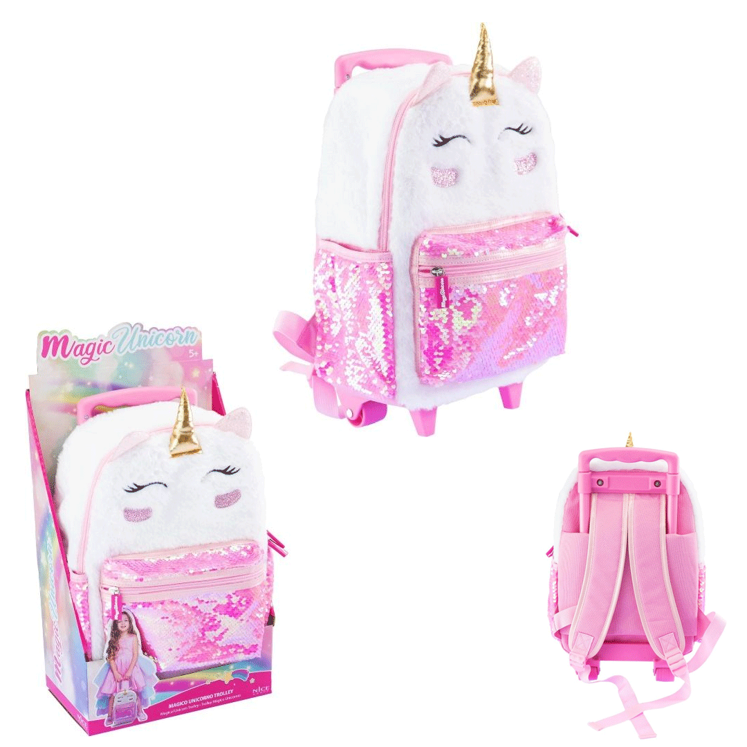 Allegro trolley in pelo da portare sempre con te. Spazioso e resistente è ideale per il tempo libero o per la scuola. E’ provvisto di una tasca principale e di una frontale chiuse con zip, due tasche laterali con elastico, comodi spalloni imbottiti regolabili, maniglia telescopica, resistenti e stabili ruote cilindriche.