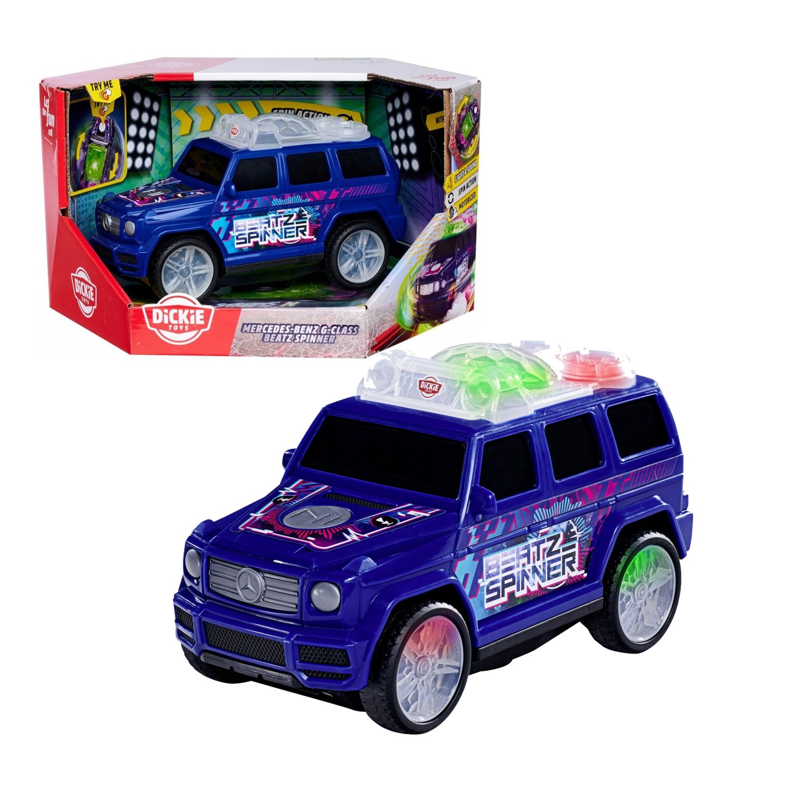 Mercedes-Benz Classe G Dickie Toys dal design unico ed accattivante, è dotata di un kit luci a bordo che può produrre uno spettacolo di luci sensazionale. Con sistema musicale di bordo, la Mercedes Spinner è la stella di ogni collezione di macchinine. Oltre a un telaio premium e divertenti effetti luminosi e sonori, il veicolo da corsa Dickie Toys è dotato anche di un sistema musicale integrato in grado di riprodurre melodie divertenti.