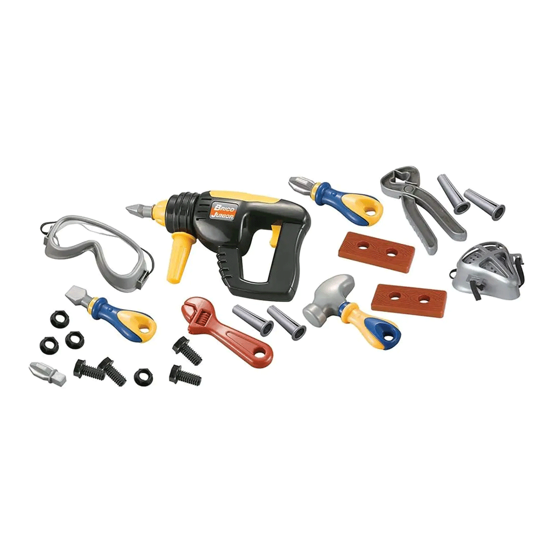 - Set include punte intercambiabili, cacciaviti, chiavi e occhiali di sicurezza giocattolo.