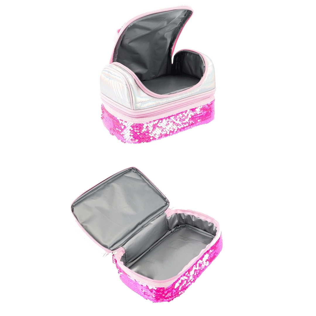 Grazioso e compatto contenitore per il pranzo, a doppio scomparto con chiusura zip, rivestito di morbido tessuto cangiante e tasche di paillettes reversibili in colore magenta. La Lunch Box e dotata di 2 scomparti con chiusura a cerniera zip e di una comoda maniglia in tessuto cucita nella parte superiore del contenitore. L`interno è rivestito con tessuto resistente all`acqua e può contenere diversi alimenti. La sua forma compatta rende la sacca porta pranzo facilmente trasportabile, occupando poco spazio. I materiali con cui è stata realizzata la Lunch Box sono testati e sicuri e rispettano le normative europee. La si può usare per trasportare bevande e alimenti a scuola, in campeggio, all`asilo, al mare, in palestra. Le dimensioni del contenitore portavivande è di base 24 cm x altezza 15,50 cm x profondità 15,50 cm.